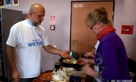 Szanowni Państwo do tej pory w licytacjach zebraliśmy już 19.393 zł! Państwu, którzy zbierali pieniądze przy wejściu udało się zebrać 1311zł! Koszuli z napisem „Gramy dla Wiktora”, sprzedaliśmy wszystkie i udało się uzbierać kwotę 1310zł! Panie ze Stowarzyszenia Kobiet Aktywnych, które sprzedawały przepyszne ciasta zebrały 1552zł! Nie został ani jeden kawałek z tych pyszności! Związek Emerytów i Rencistów sprzedający różnego rodzaju gadżety zebrał 434 zł! Dzisiaj specjalnie dla Wiktora przyjechał Pan Ludwik Skworcz z Ewangelicznego Związku Bohaterskiego. Pan Ludwik zawsze jest z nami i dzisiaj na rzecz Wiktora wpłacił 1200 zł! Brawo Panie Ludwiku! Serdecznie dziękujemy! Fundacja Nasz Drawień przygotowała przepyszne pierogi i oczywiście one wszystkie także zniknęły w oka mgnieniu. Paniom udało się uzbierać 440zł! Zaczynaliśmy imprezę mając na koncie ponad 11 tysięcy. Na chwilę obecną mamy już 36 700 zł!!!